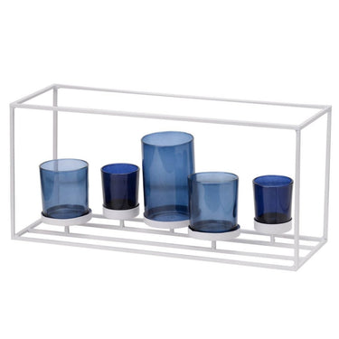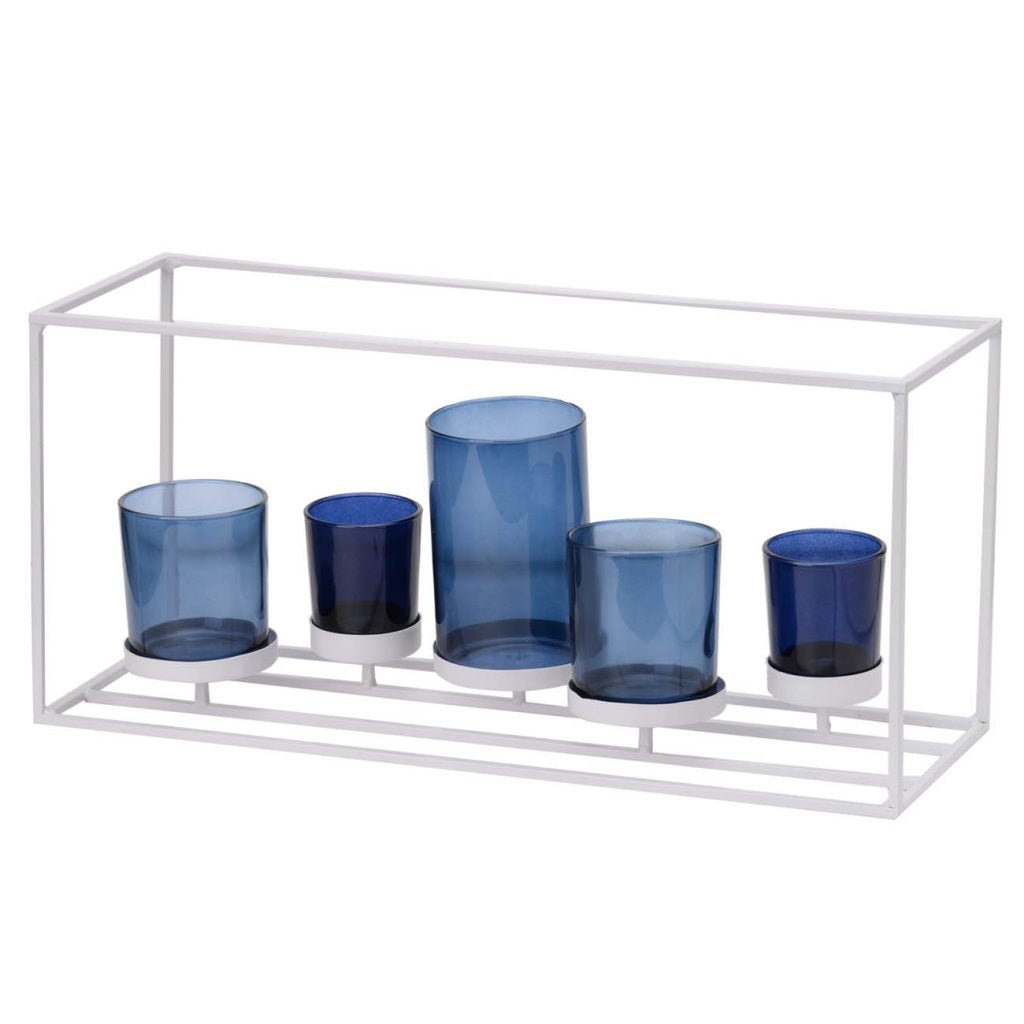 With its crisp white frame, rich blue glass, and a delicate shine, the Urupa Five-Votive Candleholder offers understated style that complements nearly any home or office. Feature this lovely candleholder above the mantle in an airy living room, on the coffee table in an ocean-inspired sunroom, or on a bright kitchen island. Surround with plants or flowers to create a lush, custom look.