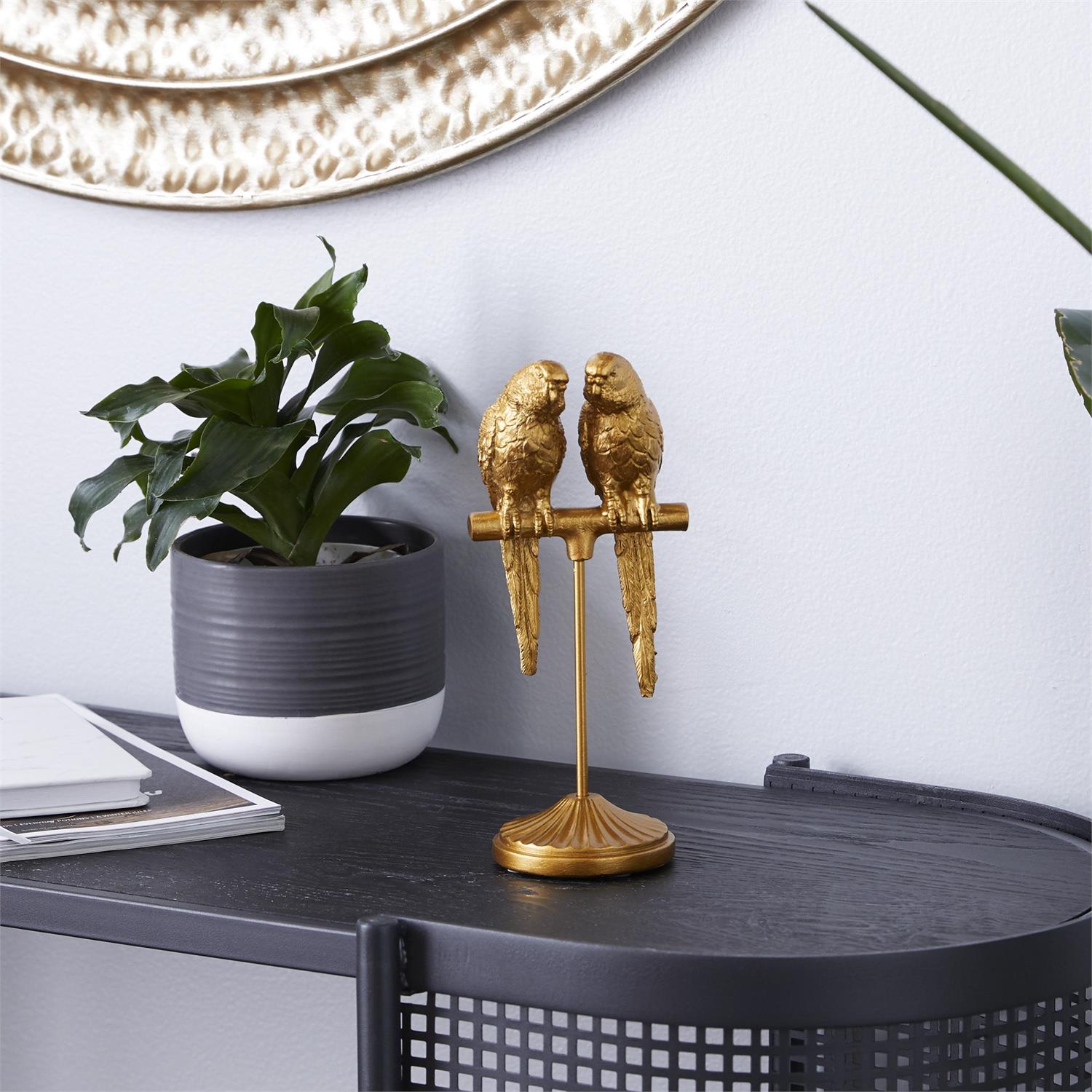 - Satin gold home decor figurine showcases two parrot figures atop a round base, making it a standout piece in any room