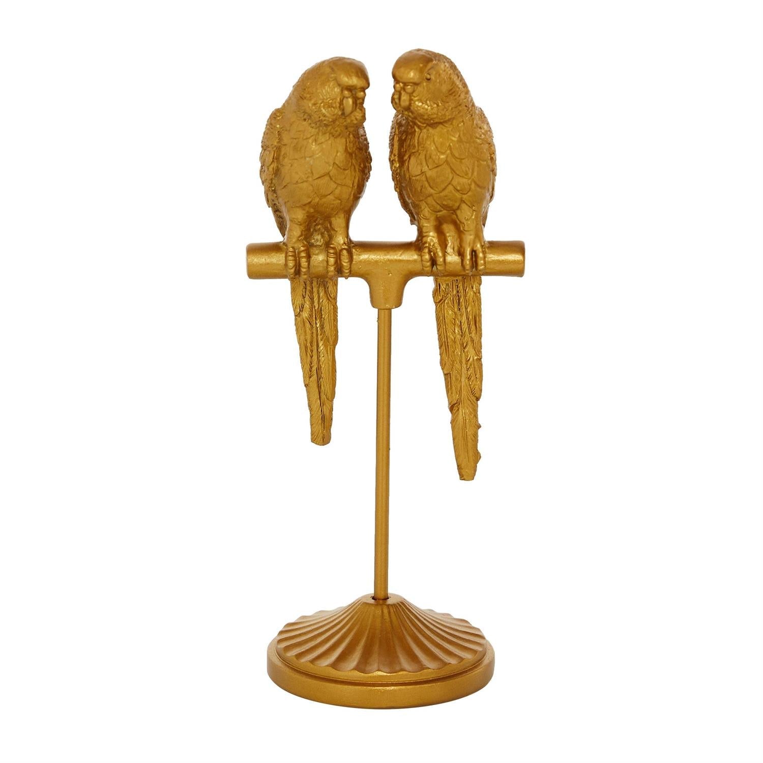 - Coastal accent statue is molded from polyresin, shaped into two parrot figures, and finished with a brilliant satin gold coating