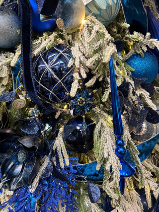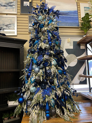 Step into a winter wonderland with the Midnight Frost Christmas Tree. This stunning flocked tree captures the serene beauty of a snowy night, adorned with a monochromatic palette of shimmering blue. Featuring a mix of glossy, matte, and glittered ball ornaments along with elegant finials in varying shades of blue, Midnight Frost brings a sophisticated and calming touch to your holiday decor.