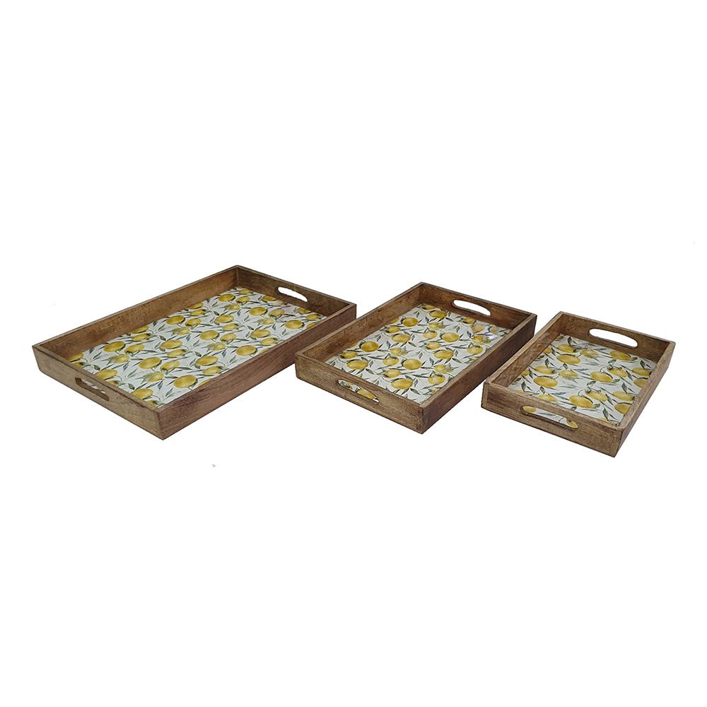 Each decorative tray in this set of three features a cheery lemon print that’s sure to brighten up transitional decor in a kitchen or dining room.The multicolored print on each tray stands out against the dark wood frame.This set includes a small,medium,and large tray.Display them together or separately to create a coordinated look in a living room or hallway.