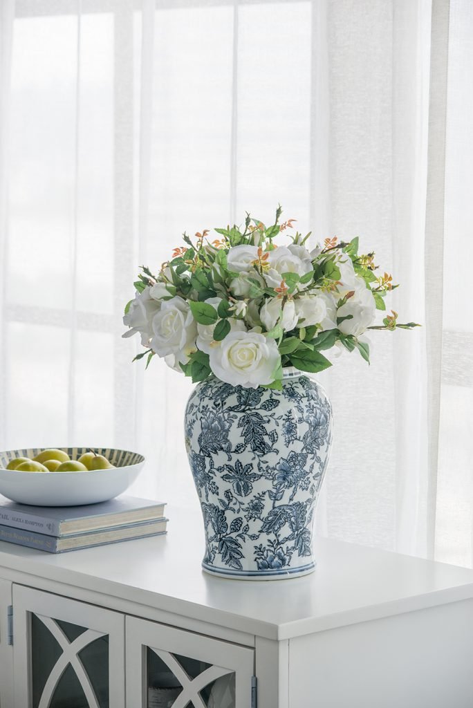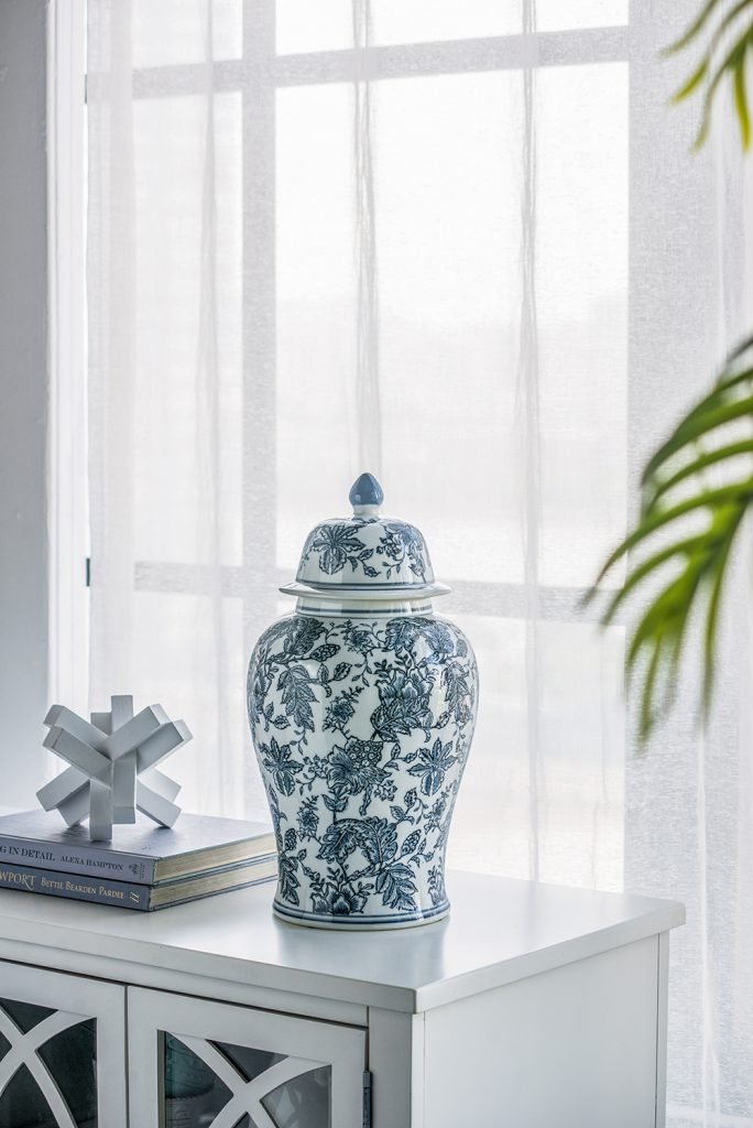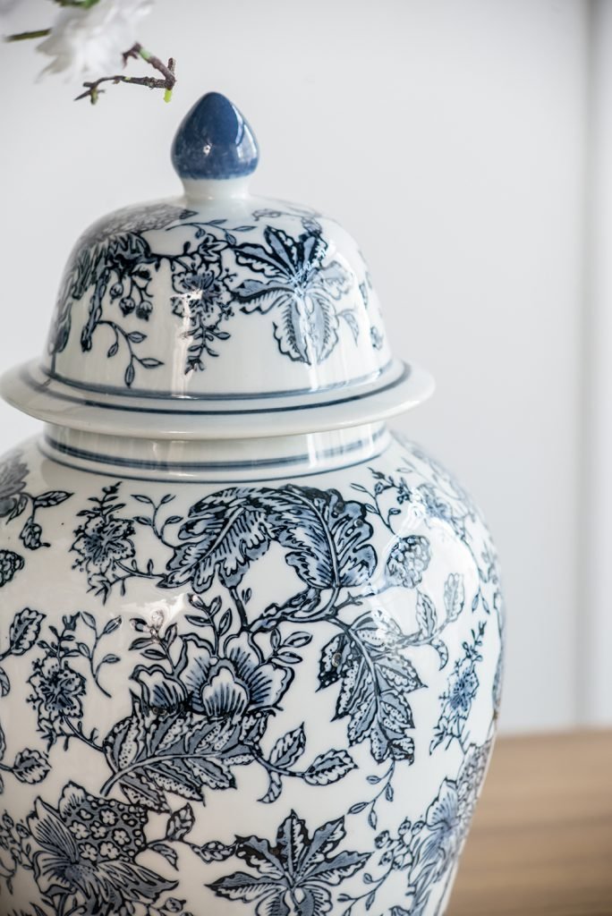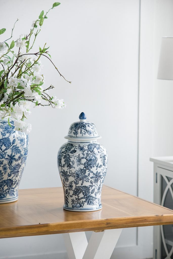 A chinoiserie pattern in a classic combination of blue and white defines the aesthetic of this 18″ ginger jar. Its voluptuous shape and lid make it a sophisticated addition to a home with traditional decor. Place it on a side or console table to bring a luxurious feel to the space.