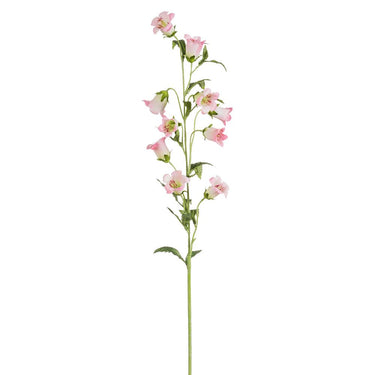 Our light pink campanula spray features a long green stalk with multiple pink bell-shaped blooms sprouting from it vertically.