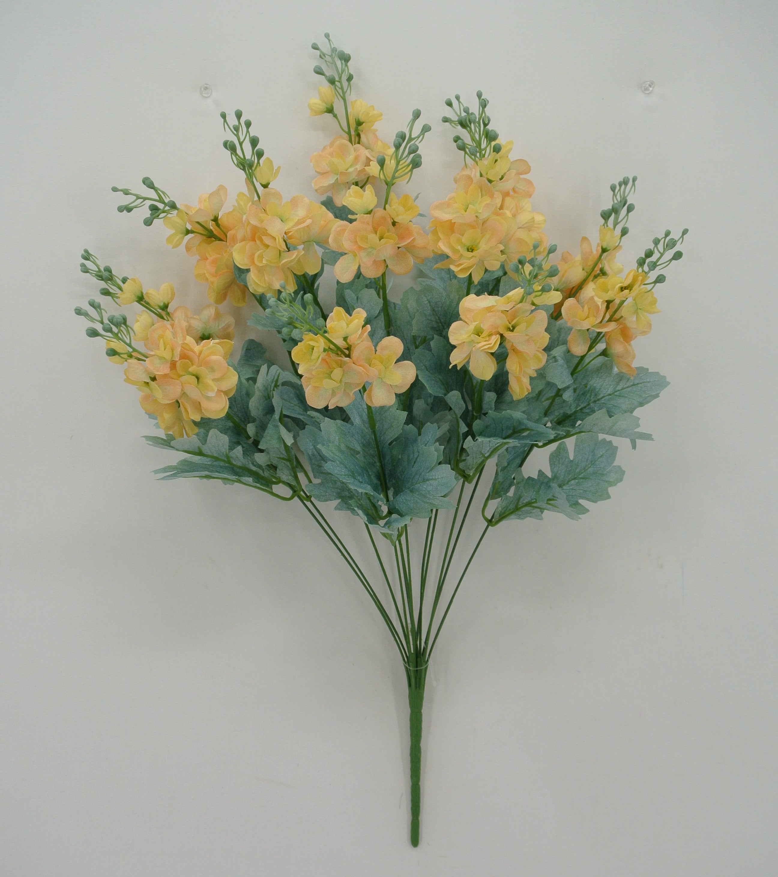 Brighten your space with the stunning Delphinium Bush Yellow 24". This exquisite artificial flower arrangement brings a touch of elegance and warmth to any room, making it a perfect addition to your home décor or event styling.