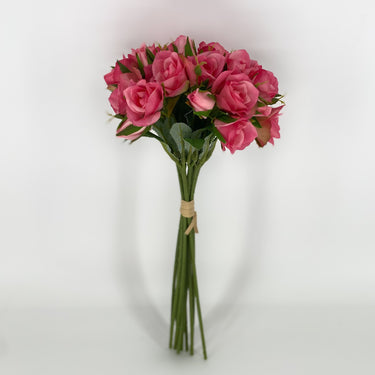 Bring a burst of vibrant color to your space with our Rose Bundle Hot Pink 12". This stunning arrangement features a generous assortment of petite rose blooms and buds, meticulously crafted to mimic the beauty of real roses. Each bundle is artistically tied together with a simple hand tie, adding a touch of charm to this elegant piece.